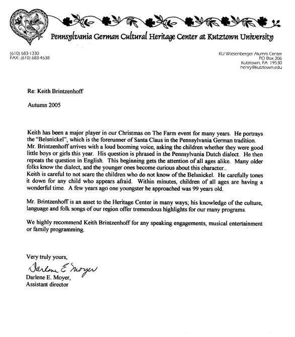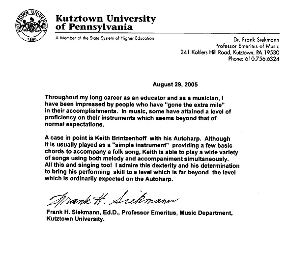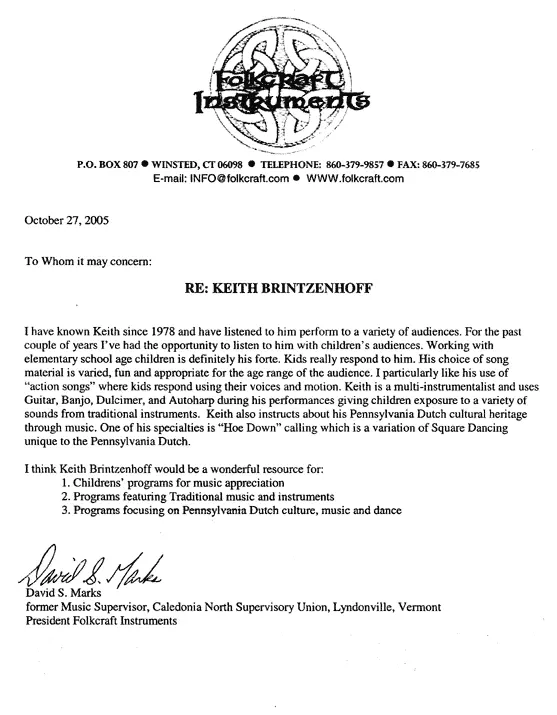 Keith Brintzenhoff was a Commonwealth Speaker for the Pa. Humanities Council (and in their TV series) for 10 years His topic was Pa. German music, dance, instruments, culture, folklore, and language. He was, and still is, a school teacher, with a B.A. in Sociology from Albright College, and a Masters in Elementary Education from Kutztown University (and many more credits). He taught Pa. German language (with culture, folklore, and history) as a 3 credit course for 3 years at Kutztown University. He studied autoharp with some of the best in the world, and was consultant for the one built by Folkcraft Instruments of Connecticut. He has investigated the mountain dulcimer and it's Pa. German connections, and discussed this with the researcher who did his doctoral dissertation on this instrument. He also plays guitar and banjo. He is musical advisor for the Kutztown Folk Festival, founder, emcee, music coordinator, and band leader for the Berks Fiddle Fest, as well as a performer. Included in his many performances are: Hershey Museum; Historic Schaefferstown; Der Dutch Peddler Homecoming (Ohio);Berks County Heritage Festival; Lyons Fiddle Festival; Mayfair; Mercer Museum Folk Festival; Reading Liederkranz; Landis Valley Farm Museum; Musikfest (Bethlehem);SEVEN tours in Germany (some with partner and/or band);700th anniversary of Switzerland Fescht in his ancestral home town of Brenzigkoffen;. Included also are many appearances on radio and TV, in the US and Germany, plus 3 C.D.s, and music for several videos and films.